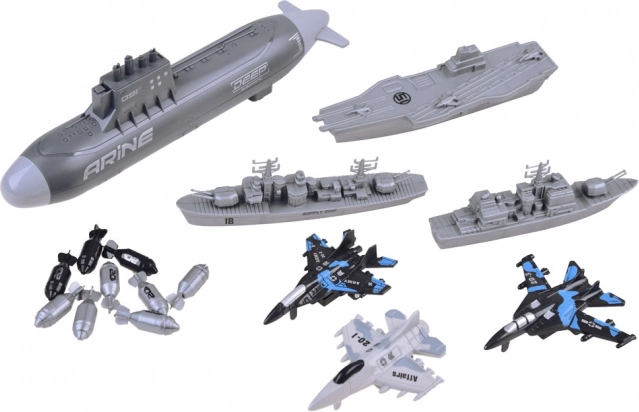 La vedette est le sous-marin avec propulsion par deux roues arrière, qui se déplace facilement à la surface. Le porte-avions sert de base pour 3 avions de combat, tandis que le navire de ravitaillement et le destroyer complètent la flotte. 15 bombes incluses ajoutent tension et action aux missions.