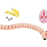 Le serpent se recharge via USB, la télécommande utilise des piles AG13. La boîte contient le serpent, la télécommande et le câble de charge.