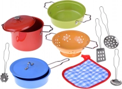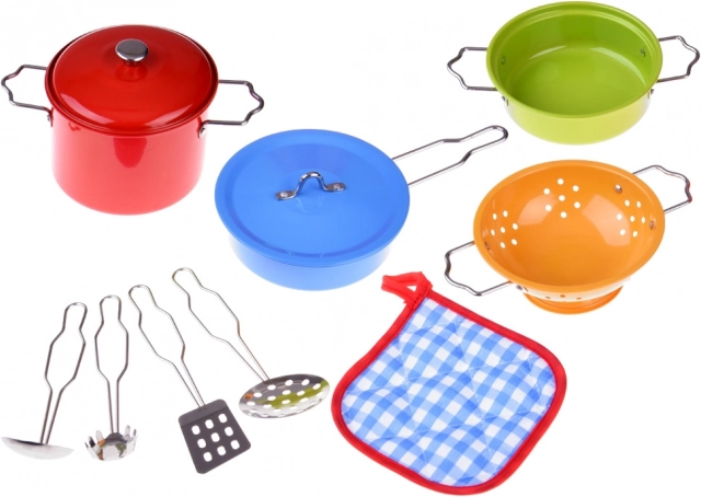 Un set en métal coloré pour petits chefs qui offre un jeu de cuisine réaliste. Il comprend des casseroles, une poêle, une passoire et des ustensiles, idéal pour développer l’imagination, la motricité fine et les jeux de rôle dans une cuisine pour enfants.