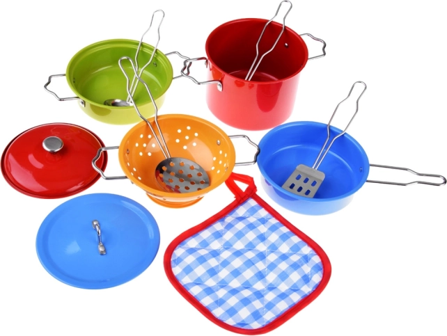 Ce set métallique de qualité imite fidèlement de véritables ustensiles de cuisine et séduit par ses couleurs vives et sa conception résistante. Les enfants prépareront des « gourmandises » pour leurs poupées et peluches tout en développant leur créativité et leur habileté.