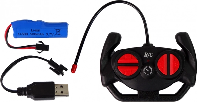 Le jeep est alimenté par une batterie rechargeable 3,6 V (incluse, avec câble USB). La télécommande nécessite deux piles AA 1,5 V (non incluses). Parfait comme coffret cadeau pour les enfants à partir de 8 ans.