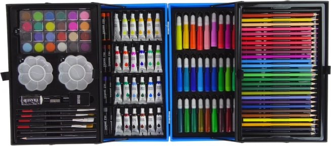 Set artistique complet en boîte comprenant tous les outils essentiels, tels que crayons, marqueurs, aquarelles et pastels à l'huile. Chaque section est conçue pour préserver des objets spécifiques, apportant de l'ordre à la création.