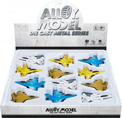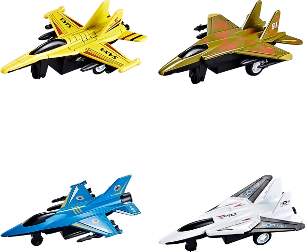 Avion en métal à rétrofriction avec des dimensions de 10x7x4 cm, disponible en quatre variantes de couleurs : blanc, bleu, vert, et jaune.