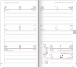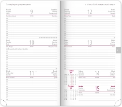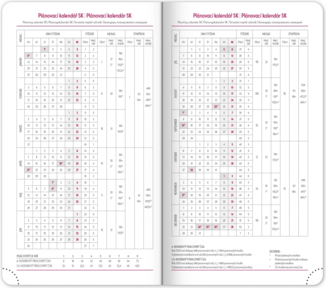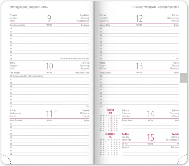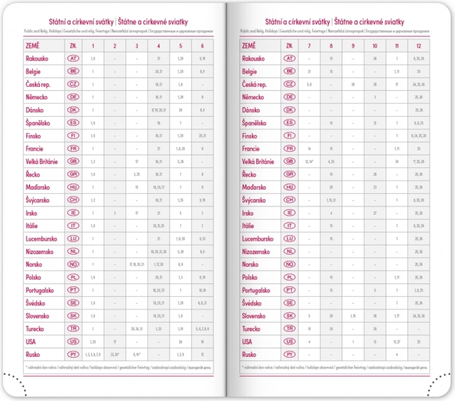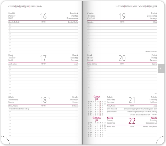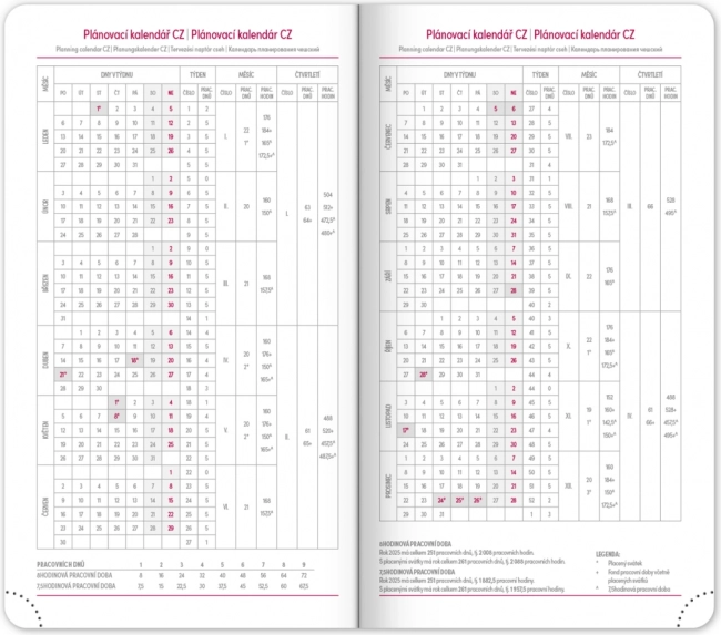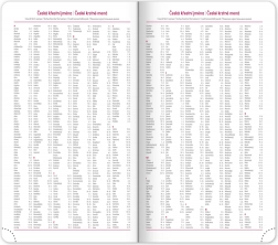 L’agenda offre un agencement hebdomadaire clair avec calendrier tchéco‑slovaque et anglais, allemand, hongrois et russe en langues complémentaires. S’y ajoutent des plannings mensuels et annuels, l’aperçu des jours fériés, une liste élargie des prénoms tchèques ainsi que des cartes. Les coins arrondis, le marque‑page textile et les coins perforés facilitent l’usage au quotidien, tandis que la possibilité de marquage de l’année et du logo séduira les entreprises comme les utilisateurs exigeants.