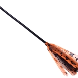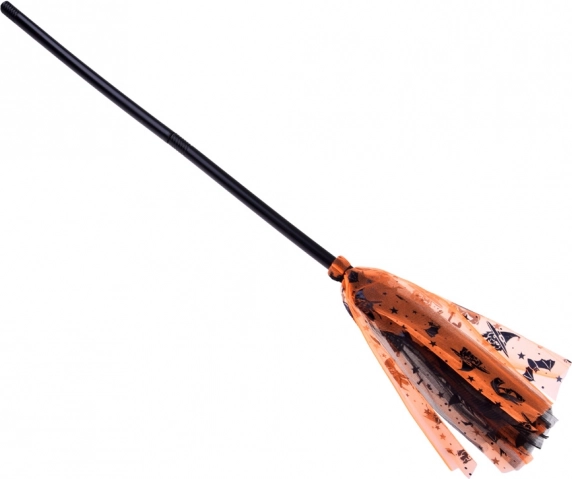 Balai avec poignée en plastique et franges textiles dans des tons orange et noir, pour compléter la tenue, idéal pour jouer et pour les photos.