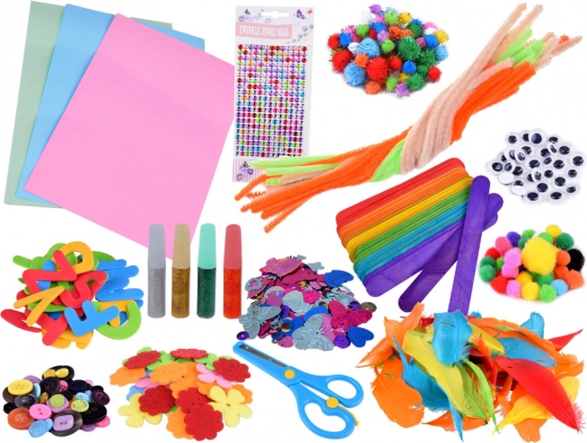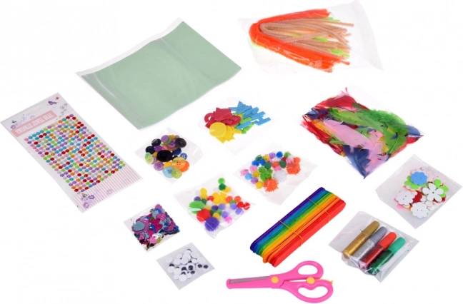 Le kit contient divers composants, tels que des petits yeux, des plumes, et du feutre, permettant de créer des œuvres artistiques variées et de stimuler l'imagination.