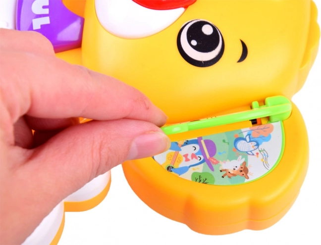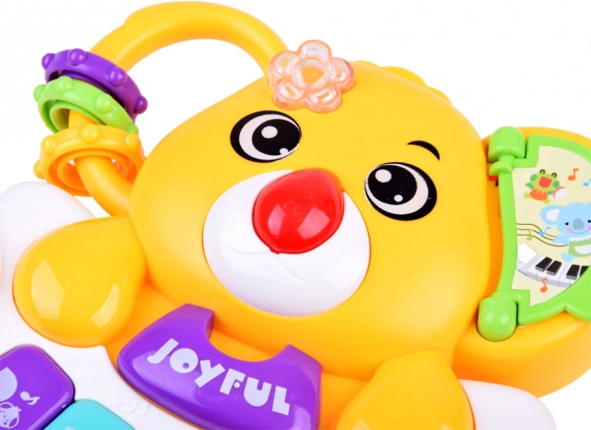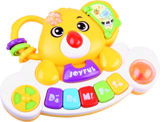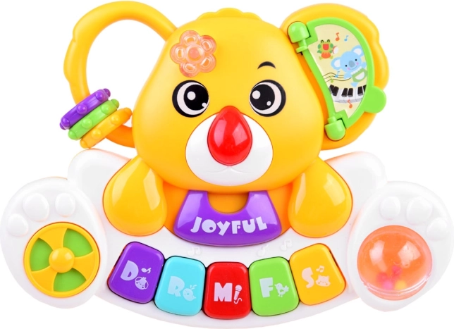 Ce petit piano interactif et coloré allie apprentissage et amusement. Les enfants découvrent la gamme de base Do–Sol, écoutent des mélodies joyeuses et des sons d’animaux authentiques (chien, coq, cheval, chat, éléphant). Chaque pression sur une touche est accompagnée d’une lumière clignotante qui change de couleur et stimule la vision.