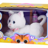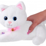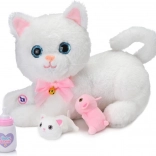 La chatte interactive blanche est la compagne idéale pour les petits amoureux des animaux. Elle a de grands yeux bleus, un nœud rose avec une clochette et une peluche soyeuse qui donne envie de la câliner. Dans son ventre se cachent deux petits chatons et l’ensemble comprend aussi un biberon rose pour jouer à les nourrir.
