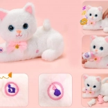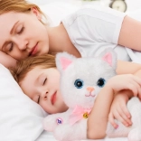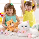 Le jouet réagit au toucher et aux accessoires : lorsqu’on la caresse, elle ronronne et miaule, elle joue des mélodies joyeuses (par ex. Happy Birthday, If You’re Happy and You Know It, Twinkle Little Star), lorsqu’on approche le biberon, elle émet des sons de boisson et les chatons, placés sur le petit cœur du ventre, déclenchent des sons de succion. Sur les pattes, vous trouverez des boutons pour l’enregistrement et la lecture unique de votre message et pour le miaulement d’un chat en colère.
