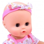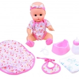 La poupée porte un body confortable avec un serre-tête doux et des chaussettes. Le coffret comprend aussi un pot, une couche, un bavoir, un biberon et une tétine, pour un soin complet sans rien oublier. Sa taille d’environ 30 cm est idéale pour les petites mains et facile à emporter.