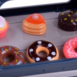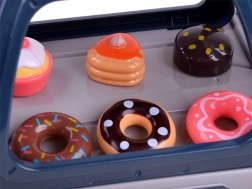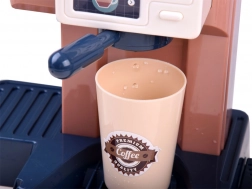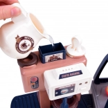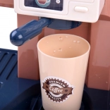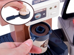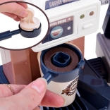 Ce set réaliste permet aux enfants d’ouvrir leur propre café : ils préparent un « espresso », exposent les gâteaux dans la vitrine et enregistrent la commande à la caisse. La machine à café avec écoulement d’eau, après remplissage par le haut et insertion du porte‑filtre, « prépare » le café avec une signalisation lumineuse (rouge pendant la préparation, vert une fois terminé) et des sons de mouture et de versement. La caisse possède un panneau rotatif, bipe lors du paiement par carte et émet un son à l’ouverture.