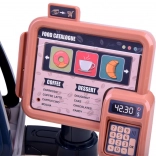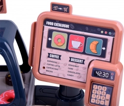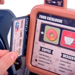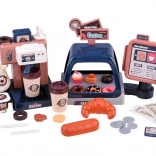 Exposez gâteaux, baguette et petit pain, préparez le café avec gobelets et couvercles. Pièces, billets et carte de paiement sont inclus pour un service client réaliste.