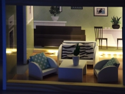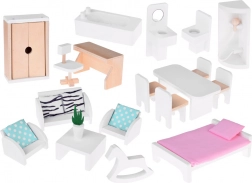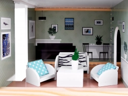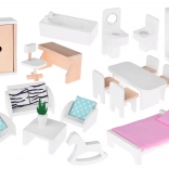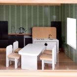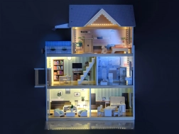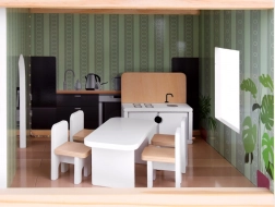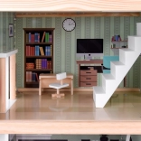 La maison est soigneusement conçue avec une illustration réaliste et des meubles en bois, donnant une sensation de vie réelle.