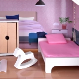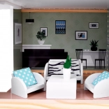 Les meubles en bois élégants avec une finition naturelle et blanche s'harmonisent parfaitement avec les couleurs pastel délicatement choisies de la maison. Chaque étage et chaque pièce offrent des illustrations murales qui donnent une atmosphère chaleureuse à l'intérieur et aident à l'exposition des meubles.