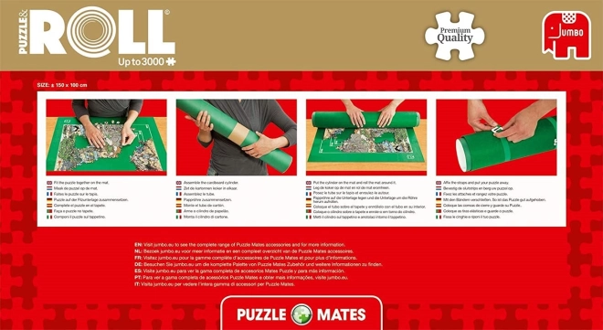 Le tapis enroulable JUMBO est un excellent assistant pour tous les amateurs de puzzles. La surface en feutre vert maintient les pièces en place et vous permet de rouler le puzzle assemblé sans crainte de déplacement ni de perte. Idéal pour le rangement à la maison comme pour les voyages.
