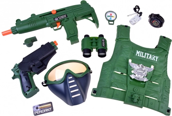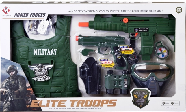 Cet équipement militaire complet ravira tous les petits aventuriers. Grâce au gilet tactique léger et à la large gamme d’accessoires, les enfants peuvent facilement jouer aux éclaireurs, gardes ou héros. Les armes avec effets sonores et le masque amovible renforcent l’authenticité du jeu, tandis que la boussole et la jumelle stimulent l’imagination et l’orientation sur le terrain.