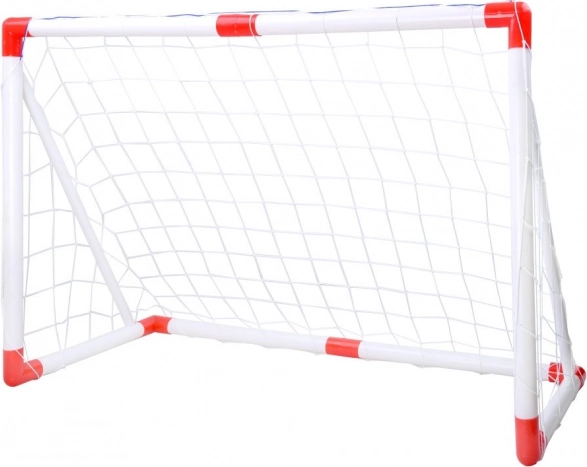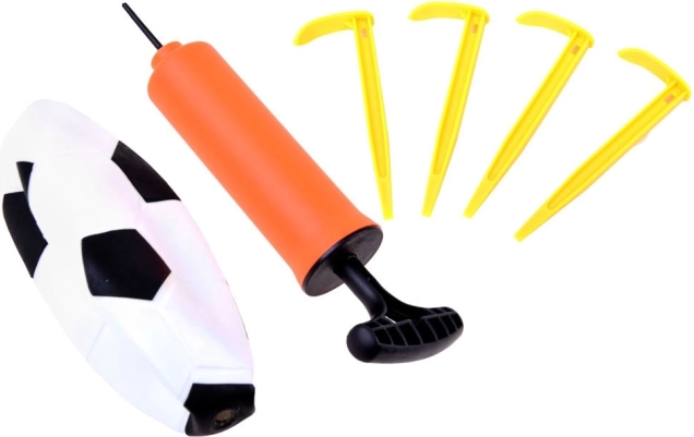 L’emballage comprend le but avec filet, le ballon, la pompe et 4 piquets d’ancrage – tout ce dont les enfants ont besoin pour jouer immédiatement.