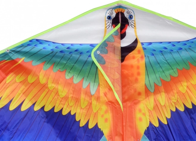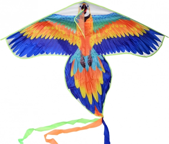 Le design en forme de perroquet, avec des détails bleu‑jaune‑orange, se détache dans le ciel et aide à l’orientation pendant le vol.