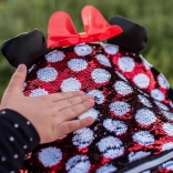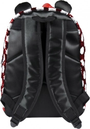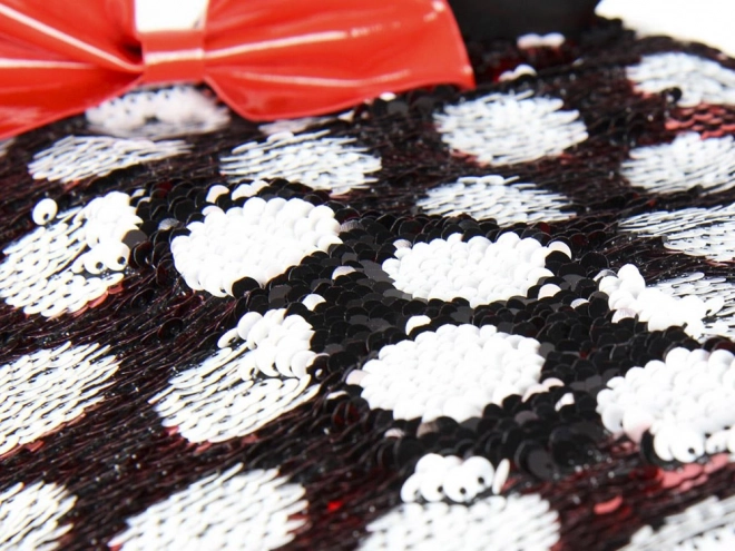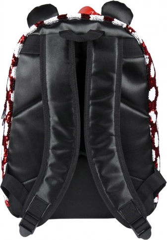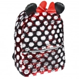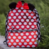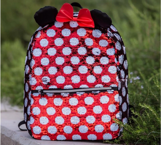 Le sac à dos au motif emblématique de Minnie, en rouge et blanc à pois, orné d’un nœud rouge et d’oreilles scintillantes, est véritablement magique.