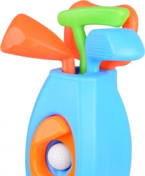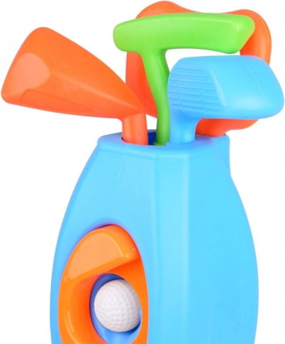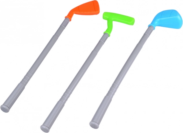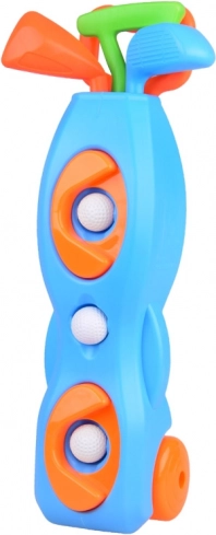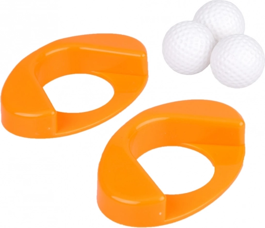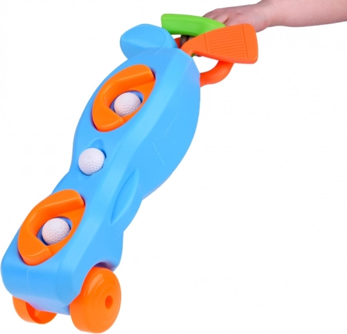 - 3× club de golf, 3× balle, 2× trou avec base, 1× support/chariot à roulettes