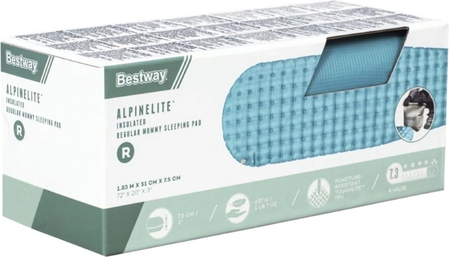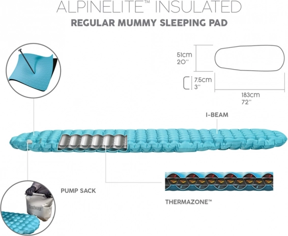 Le tapis de sol AlpineLite Insulated Regular Mummy est un choix idéal pour celles et ceux qui souhaitent profiter du confort lors de moments de détente à la plage, en camping ou pour passer la nuit sous la tente. Le gonflage est simple et rapide grâce au système innovant AirCinch™, il suffit d’appuyer avec les paumes sur le sac pour que le tapis se remplisse rapidement d’air. Ce set est complet, vous n’avez donc pas à craindre d’oublier une pompe.