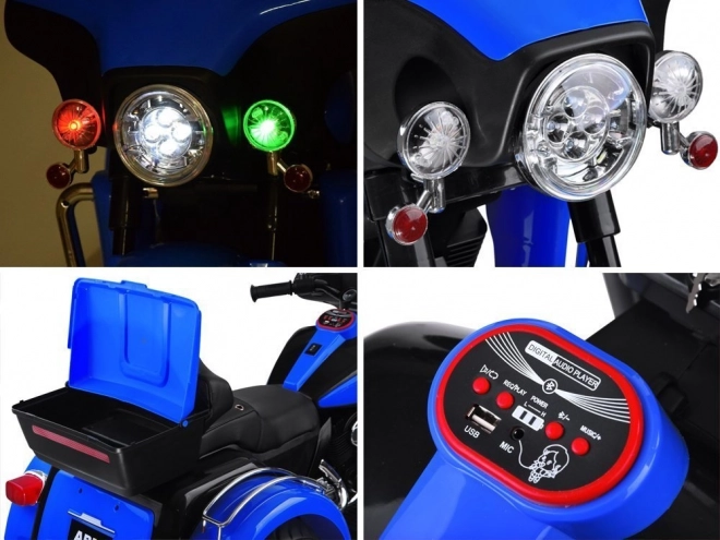 La moto présente une finition très attrayante, avec des phares avant colorés et un coffre verrouillable pour les trésors.