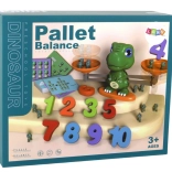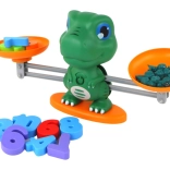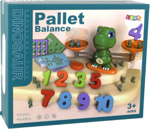 - Balance en forme de dinosaure, 2 plateaux, 30 cartes d’exercices recto-verso, 19 figurines de dinos, 10 chiffres, mode d’emploi