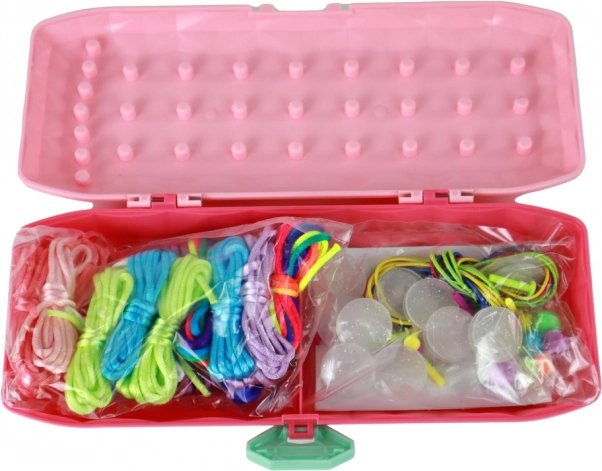 - Étui rose, fils colorés, élastiques, perles (y compris rondes), chevilles en plastique, autocollants, notice
