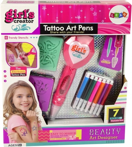 Kit créatif pour enfants permettant de réaliser des tatouages temporaires colorés et facilement lavables. Contient un stylo électronique, 6 marqueurs sûrs et 8 pochoirs pour décorer la peau rapidement et en s'amusant. Un excellent choix pour les fêtes, favorisant la créativité, la précision et la patience.