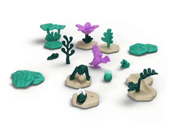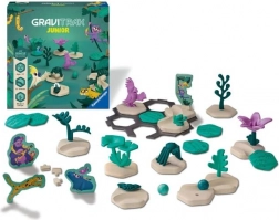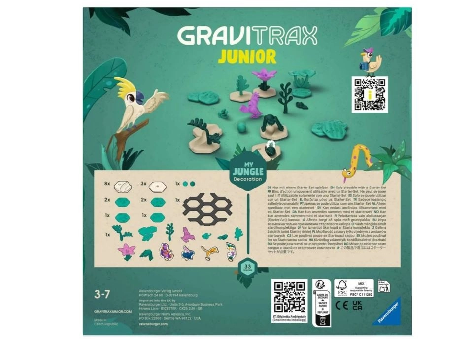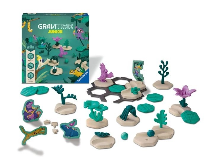 GraviTrax Junior est un système interactif de circuits à billes pour les enfants à partir de 3 ans. Les plus jeunes construisent leurs propres univers de pistes à billes, qu’ils peuvent décorer à leur guise afin de créer différents mondes thématiques. Les enfants s’amusent ainsi énormément tout en construisant de manière créative. L’extension Jungle contient divers éléments décoratifs ainsi que des figurines d’animaux et de plantes de l’environnement de la jungle. Les enfants peuvent ainsi explorer cet environnement au sein de leur circuit GraviTrax et se lancer dans une aventure au cœur de la jungle. Tous les éléments de construction et de décoration sont fabriqués en bioplastique d’origine bois. L’extension comprend 33 éléments de construction et de décoration.