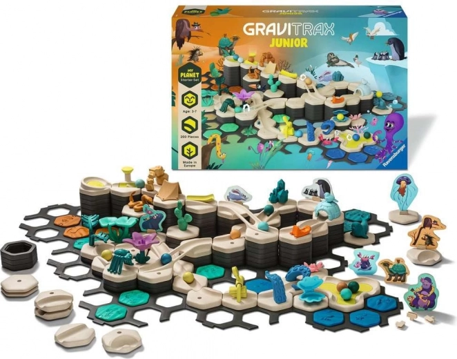 Le coffret de démarrage Planète propose des pistes traversant quatre mondes : jungle, océan, désert et paysage glacé. De riches éléments décoratifs et des figurines d’animaux apportent encore plus de fun et de scénarios étonnants. Le coffret contient 200 éléments variés, dont des plaques de base, des rails, des virages, des cales de hauteur, des éléments décoratifs, des animaux et des billes. Avec le tremplin et la balançoire, votre bille ira encore plus vite et plus loin !