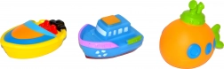 Découvrez le plaisir du bain avec un ensemble de trois jouets en caoutchouc souple – deux petits bateaux et un sous-marin. Idéal dès 0+, sûr pour les petites mains et facile à saisir. Matière souple, jeu sécurisé dans l’eau et entretien facile pour des bains toujours joyeux.
