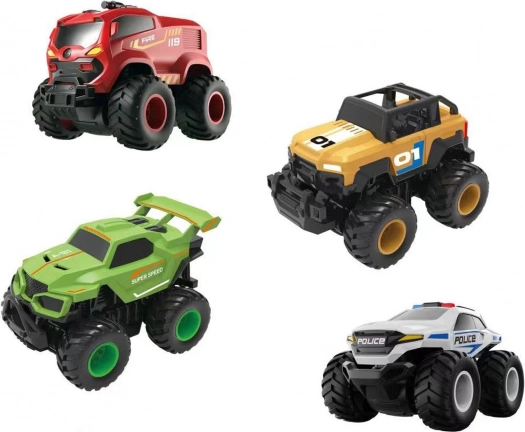 Auto Big Foot à inertie de 13 cm en quatre variantes : pompiers, police, vert et jaune.