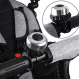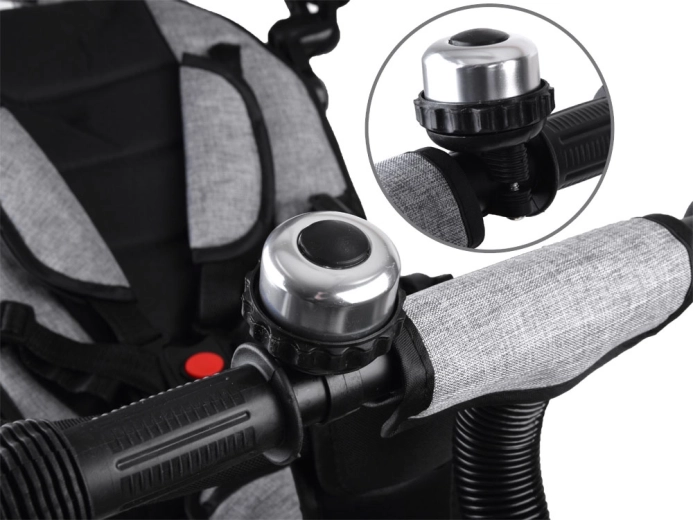 Sonnette en métal pour prévenir en sécurité et poignées en mousse sur la barre de poussée pour faciliter la conduite par les parents en environnement animé.