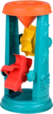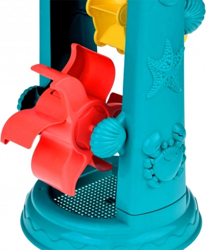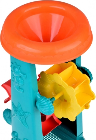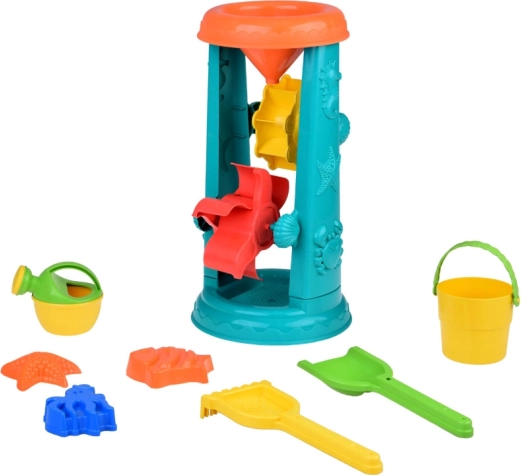 L'ensemble de sable pour enfants est soigneusement conçu avec des motifs d'animaux marins tels que des poissons et des pieuvres. La plus grande attraction est une roue à eau de 37 centimètres où les enfants peuvent verser du sable ou de l'eau et observer les *roues doubles* tourner. Cela favorise le développement de la pensée logique et la compréhension des relations de cause à effet.