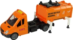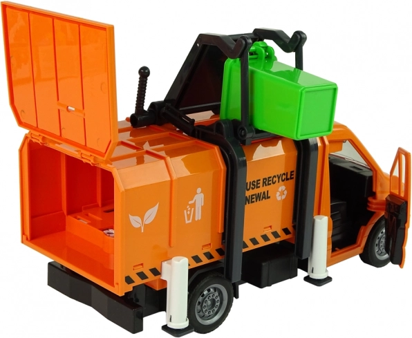 Le camion-benne orange reproduit fidèlement un véritable véhicule de collecte et transforme la chambre en petit centre de recyclage. Grâce à l’entraînement à friction, une simple poussée suffit pour le faire avancer. Le conteneur ouvrant permet de vider facilement les « déchets », tandis que le lève-bac latéral verse le contenu directement dans la benne.