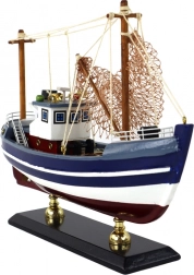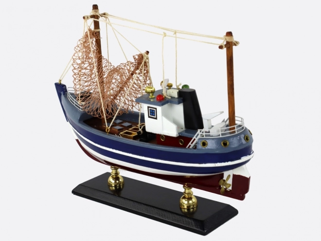 Ce modèle en bois minutieusement réalisé représente un chalutier classique sur des pieds/ un socle en bois stables. L’association du bleu marine et des rayures blanches souligne le style nautique traditionnel, tandis que les détails précis offrent un aspect réaliste.