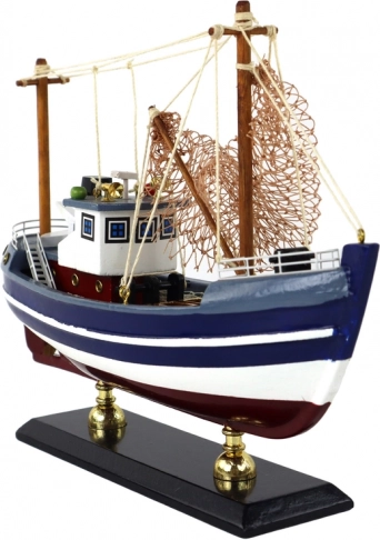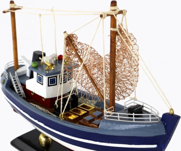 Le modèle se distingue par de hauts mâts, un filet de pêche tendu sur le pont, une cabine équipée de klaxons et de feux de signalisation. À l’étrave se trouve une barre décorative, rappelant la riche tradition de la navigation. Un excellent choix comme décoration d’intérieur élégante pour le salon, le bureau ou une étagère de collection.