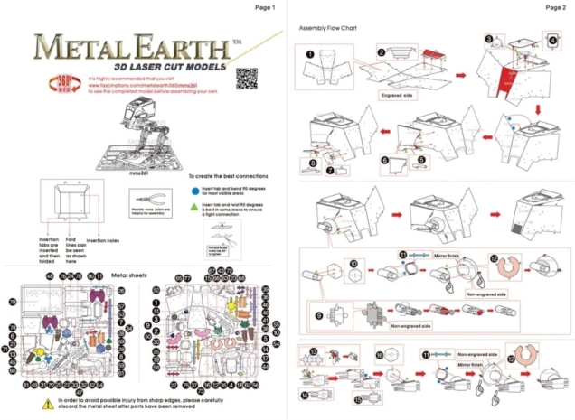 Le kit comprend 2 plaques d’acier avec pièces découpées et une notice claire. Les éléments s’assemblent à l’aide de languettes pliées, vous n’avez donc pas besoin de colle. Seules de petites pinces coupantes et une pince fine sont recommandées pour faciliter l’extraction et le formage. Le modèle fini a des dimensions compactes, parfaites pour une étagère ou un bureau.