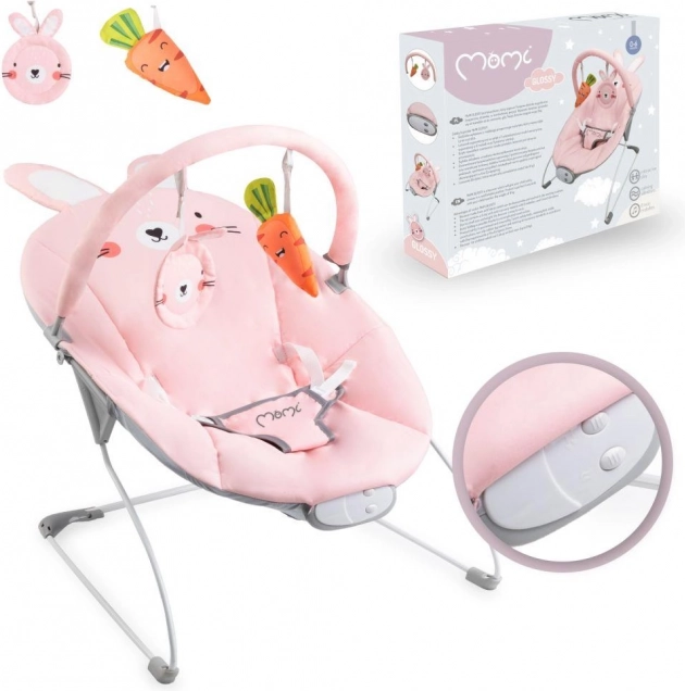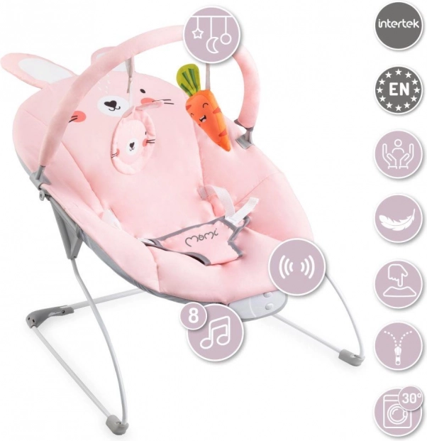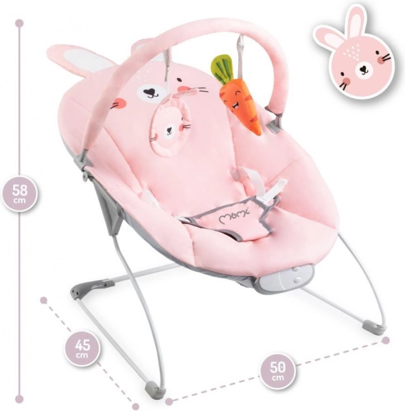 MoMi Glossy est un transat vibrant pratique conçu pour les tout-petits, de la naissance jusqu’à 6 mois. Grâce à sa structure compacte et légère, il se transporte et se plie facilement, idéal à la maison comme en déplacement. Son adorable design de petit lapin rose plaira aux enfants, tandis que les parents apprécieront sa stabilité et sa facilité d’entretien.