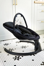 MoMi Kenani Onyx est une balancelle électrique moderne pour apaiser et divertir confortablement votre bébé dès la naissance. Sa structure en aluminium et acier, sa housse en peluche douce et son coussinet appui-tête offrent un grand confort, tandis que le harnais 5 points et les patins antidérapants veillent à la sécurité. Grâce au Bluetooth, vous pouvez facilement lancer les chansons préférées depuis votre téléphone ; l’écran LCD clair et la télécommande facilitent l’usage au quotidien.
