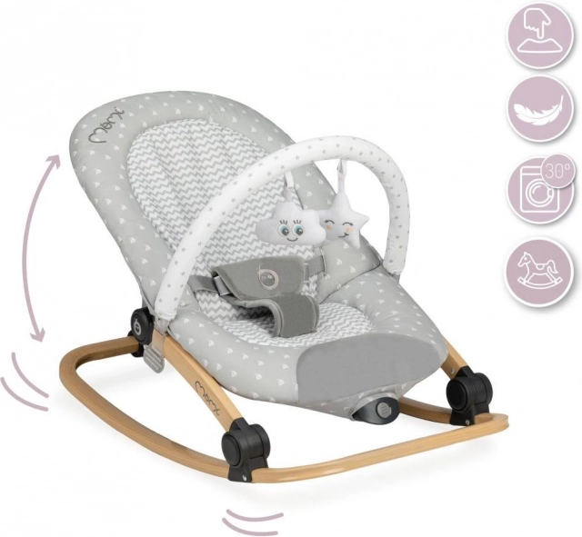 Transat vibrant MoMi Lumiwood, confortable et sûr avec mélodies, jouets et entretien facile.