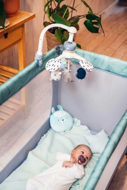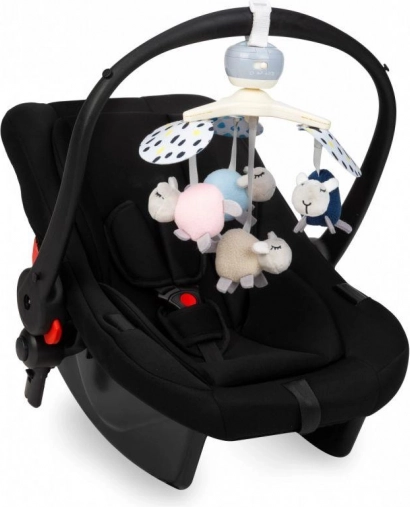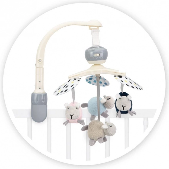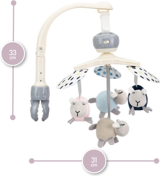 Il comprend de jouets sensoriels doux en textiles de qualité (velours, feutrine) avec éléments froissants et siffleurs. Les jouets se retirent facilement pour une utilisation séparée ou un lavage en machine. La rotation lente stimule en douceur la perception visuelle et la concentration du bébé.