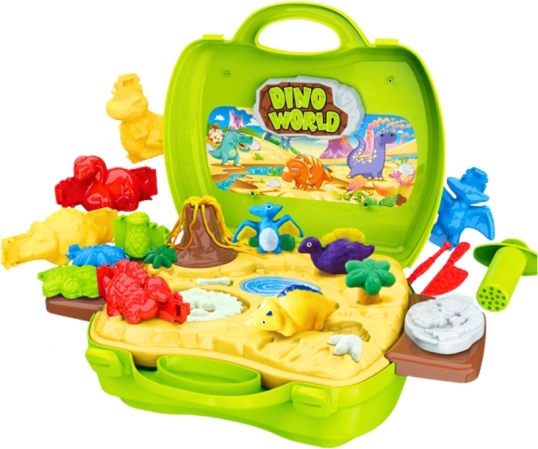 pâte à modeler de différentes couleurs, moules de dinosaures, outils de modelage, station pour empreintes de pas, étagères pour accessoires, valisette de transport
