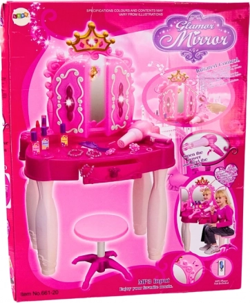 Faites entrer votre enfant dans un monde de fantaisie avec une coiffeuse dont le miroir s’illumine d’un geste de la baguette magique et l’accompagne de mélodies et petites lumières clignotantes. Grâce à l’entrée MP3, la musique préférée peut résonner pendant le maquillage et les jeux de coiffure.