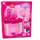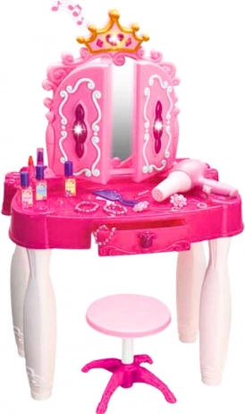 Elle comprend un tiroir pratique pour les petits objets et de nombreux accessoires : perles, élastiques, bagues, “rouge à lèvres”, flacons pour vernis ainsi qu’un sèche-cheveux jouet. Le miroir est en matériau incassable et au-dessus se trouve une petite lampe en forme de cœur pour une atmosphère magique.