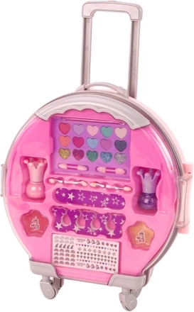 Ce set cosmétique rose pour enfants est présenté dans une adorable valisette à roulettes avec poignée télescopique, pour que les petits maquilleurs puissent l’emporter partout. À l’intérieur, un équipement généreux vous attend : palette de 15 teintes de fards à paupières (8 légèrement scintillantes, 2 mates, 5 très brillantes), 2 vernis à ongles (violet pailleté et rose classique), 2 gloss pour les lèvres, autocollants pour ongles et des outils pratiques.