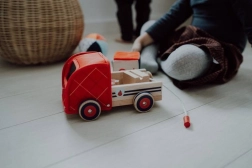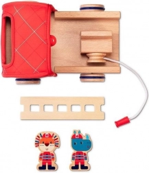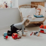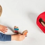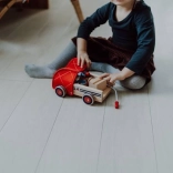 La fabrication de qualité combine bois naturel, textile résistant et métal. Les bandages en caoutchouc des roues sont doux pour le sol et la conduite est silencieuse. Le jeu développe la motricité fine (saisir, insérer, tourner, enrouler), la coordination œil-main ainsi que les perceptions sensorielles – toucher, vue et ouïe.