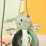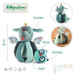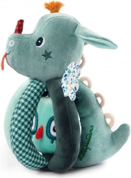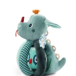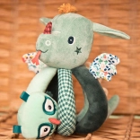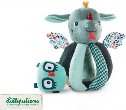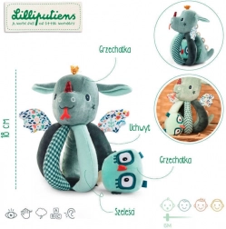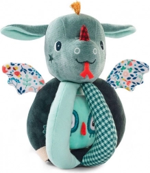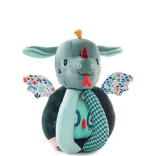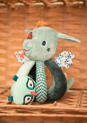 Voici le petit dragon Joe – un compagnon coloré pour les premières découvertes. Son corps en forme de balle est composé de cinq poignées souples, dont une avec des écailles sur le dos, des ailes aux matières variées, et un petit hibou amovible avec un hochet caché. Un hochet tintant se trouve dans la tête et des matériaux bruissants ajoutent d’autres sons. Le jouet encourage la préhension, l’agitation, l’insertion et le retrait, et stimule la vue, l’ouïe et le toucher.