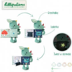 Ce doudou multifonction avec livre de la marque Lilliputiens combine une peluche douce et les tout premiers moments de lecture. Le petit dragon Joe présente des détails marquants – ailes, oreilles, petite langue adorable – et une fixation pratique du livre par velcro. Chaque page réserve un effet différent, stimulant la vue, l’ouïe et le toucher.